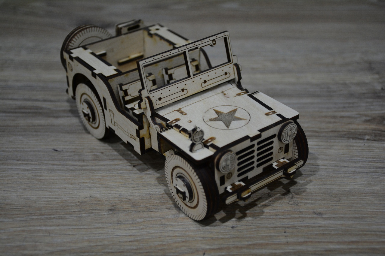 Jeep – это макет для лазерной резки, предназначенный для создания 3D моделей и пазлов. Скачать можно чертежи для лазерной резки и гравировки под фанеру в векторных форматах cdr, DFX и AI. Макет изображает модель внедорожника с детализированным дизайном, который позволяет создать объемную модель автомобиля.