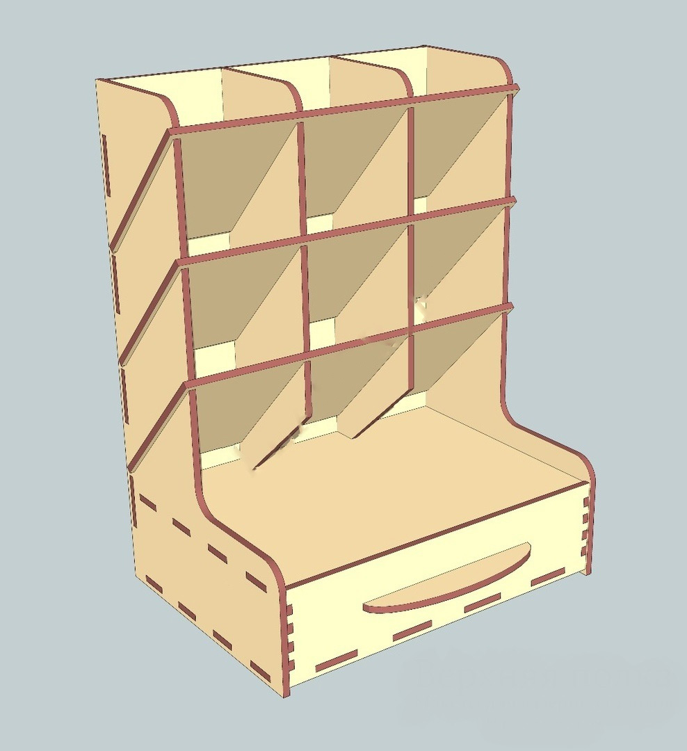 Макет органайзера для стола предназначен для лазерной резки на фанере и представляет собой функциональное решение для упорядочивания канцелярских принадлежностей. Он включает в себя несколько отсеков и держателей, что позволяет удобно размещать ручки, карандаши и другие мелкие предметы. Скачать чертежи для резки можно бесплатно, и они предоставлены в векторном формате, что упрощает процесс работы с лазерным станком.