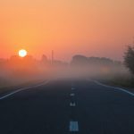 Прямая загородная асфальтированная дорога туманным утром на рассвете