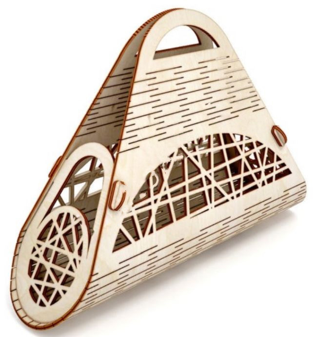 Макет для лазерной резки представляет собой сундучок, выполненный в форме сумки. Этот проект предназначен для создания сундучка-упаковки, который может использоваться для различных целей, включая хранение и транспортировку предметов. Чертеж доступен для бесплатного скачивания и включает векторные файлы в форматах CDR, DXF и AI, предназначенные для резки и гравировки на лазерном станке или фрезеровке.